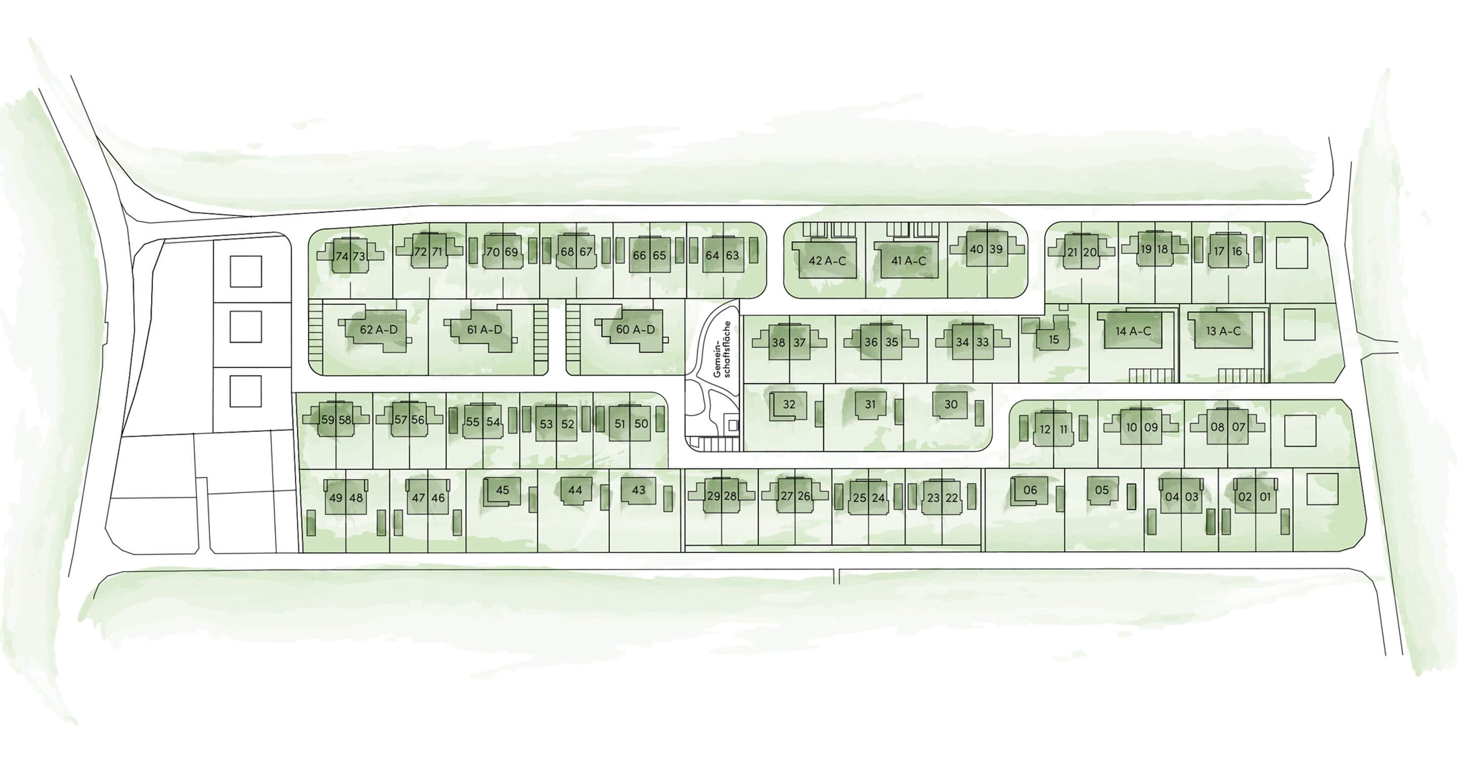 Eingebettet in eine idyllische Naturkulisse, sind die 91 Wohneinheiten – Eigentumswohnungen, Einzel- oder Doppelhäuser – ein Refugium abseits der Großstadt mit viel Freiraum und doch mitten im Geschehen.