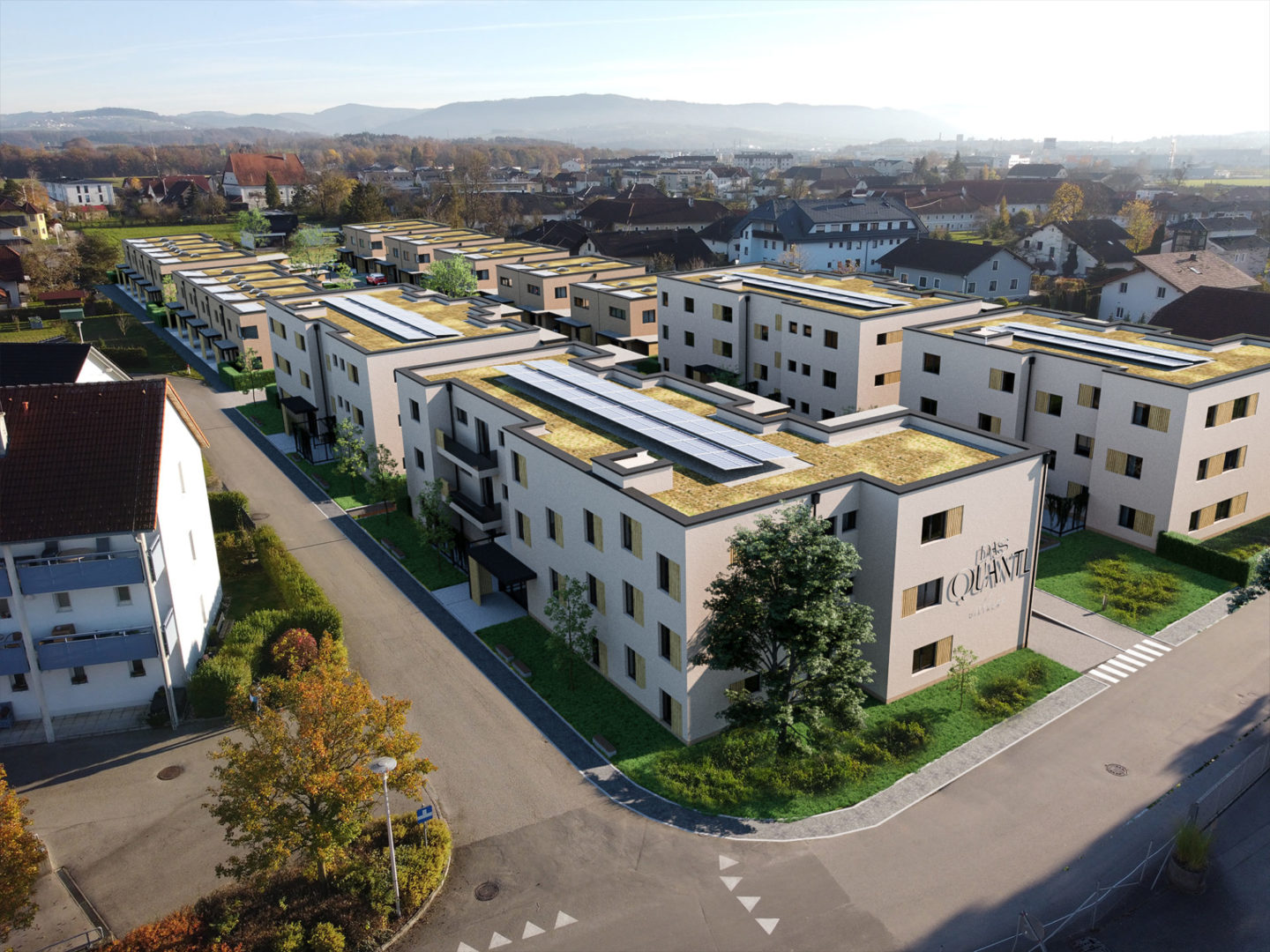 Ein Quantl bezeichnet in der oberösterreichischen Mundart ein schönes, kleines Grundstück. Im Quantl ist darum jedem Haus und jeder Erdgeschosswohnung ein kleiner, schmucker Eigengarten zugeordnet. Penthousegärten und Balkone schaffen auch in den übrigen Wohnungen viel privaten Grünraum.