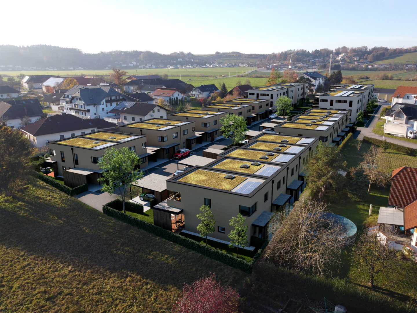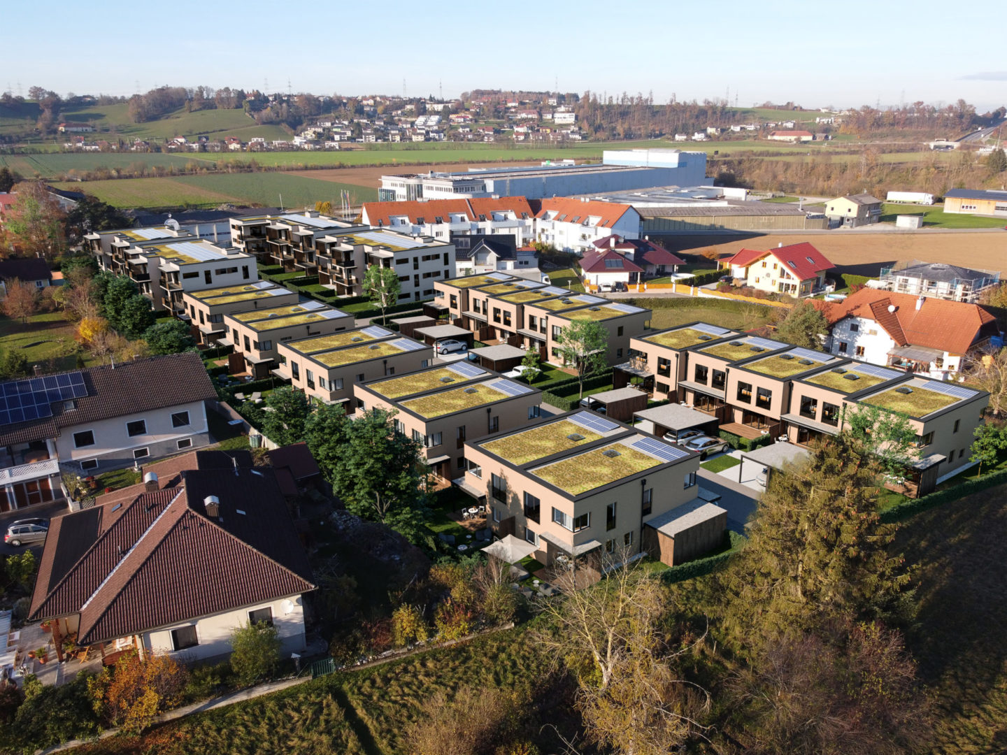 Das Energiesystem samt Luft-Wasser- Wärmepumpe, Photovoltaikanlage, Fußbodenheizung mit Kühlfunktion und kontrollierter Wohnraumlüftung mit Wärmerückgewinnung ist ressourcenschonend und kostensparend. Begrünte Dächer sorgen für ein zusätzliches Energie- und Nachhaltigkeitsplus.
