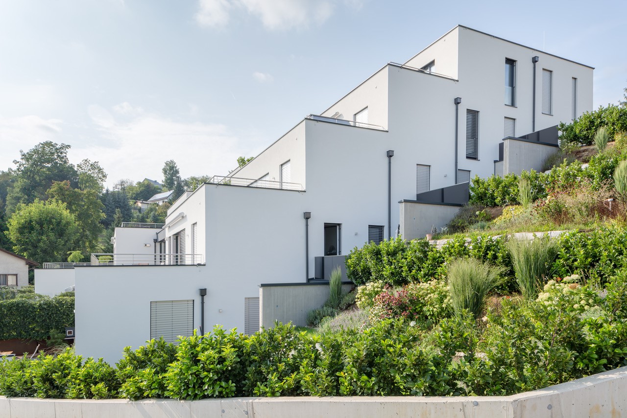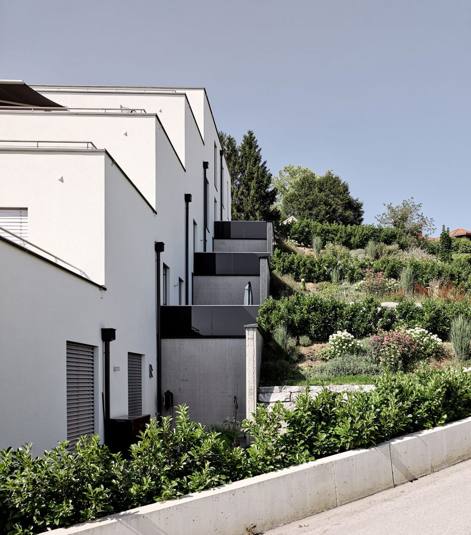 Jede Wohnung ist ein Logenplatz mit unverbaubarem Blick ins Grüne. Das Herzstück der Wohnanlage ist das Atrium, um das die 12 Terrassenwohnungen angeordnet sind. Es ist mit seinen fünf Ebenen Wintergarten und Dorfplatz zugleich, ein zwangloser Treffpunkt, ein Bereich für den Kaffeeplausch, ein Raum für besondere Anlässe oder auch nur ein architektonisches Highlight.