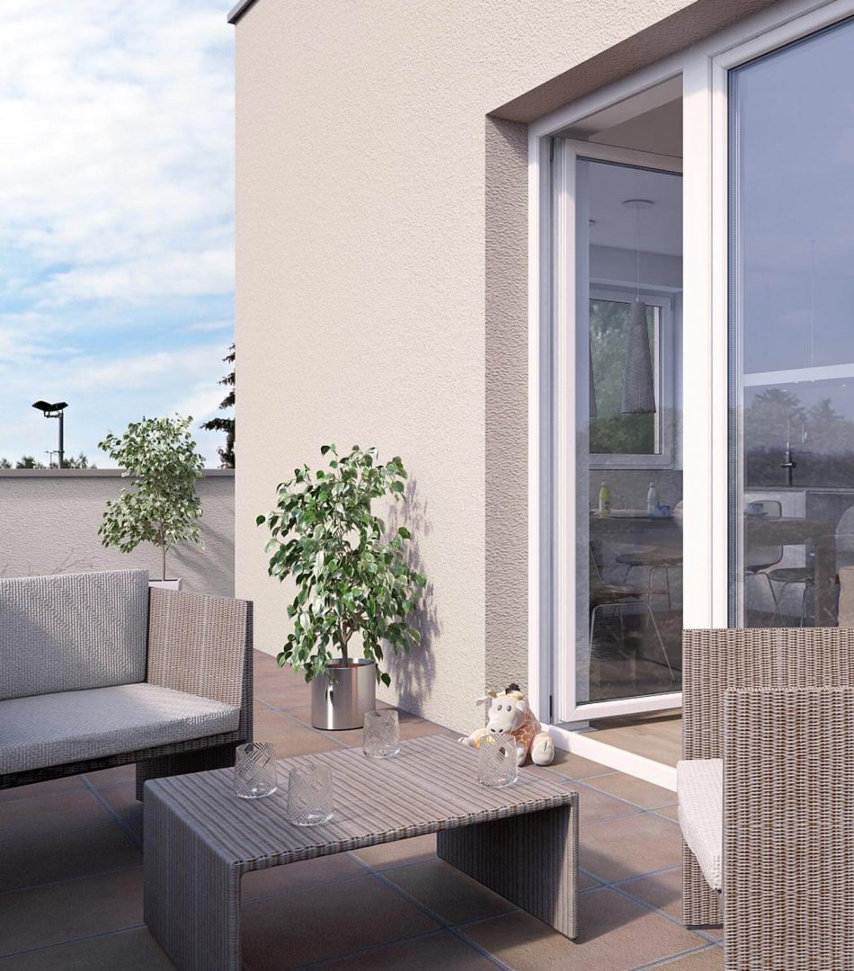 Große Fenster und Terrassentüren bringen viel Licht in die Wohnung, brauchen aber auch entsprechende Abschattung. Dafür sorgt die integrierte Raffstore-Beschattung in elektrischer Ausführung bei allen Fenstern und Terrassentüren.