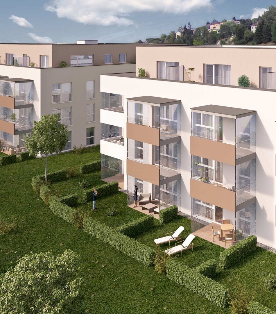 In drei baugleichen Wohnhäusern werden je 21 Eigentumswohnungen mit Wohnflächen von 55, 75 und 90 m2 realisiert. Alle Wohneinheiten punkten dabei mit privaten Freiräumen, die den Wohnraum ins Freie erweitern. Die Wohnungen im Erdgeschoss verfügen über den Luxus eines eigenen Gartens. In den Obergeschossen sorgen Loggien für ein helles und freundliches Wohlfühlambiente. Im Dachgeschoss versprechen die Penthousewohnungen samt Dachterrassen ein erhabenes Wohngefühl.
